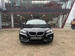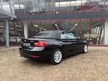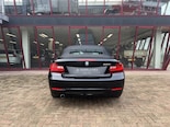 Prachtige BMW 220i Cabrio, uitgevoerd in een zwarte lakkleur met een zwarte stoffen cabriokap en een Dakota Oyster lederen interieur met donkere houtinleg, hetgeen een stijlvolle en sportieve uitstraling geeft.