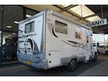 Camper heeft een grote rondzit achterin met daarboven een groot 2 persoons hefbed en een hefbed in het midden.