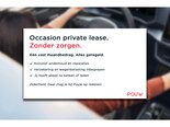Bij Private Lease van Pouw rijd je onbezorgd een gebruikte Volkswagen, Audi, SEAT, Škoda of CUPRA tegen een vast bedrag per maand. Je hoeft alleen nog maar te tanken! Dat betekent dat je geen zorgen hebt over kosten zoals afschrijving, rente, afleverkosten, verzekering, motorrijtuigenbelasting, reparaties en onderhoud of schadeherstel en pechhulp. Vraag uw Pouw verkoopadviseur naar de mogelijkheden en voorwaarden.