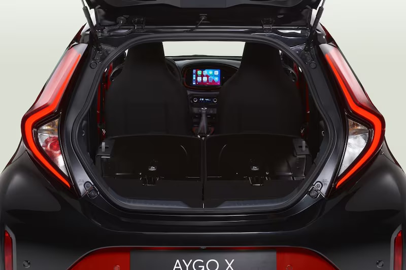 Zet de Toyota Aygo uit de AB70-generatie naast zijn voorgangers en je ziet direct dat hij een slag groter is. Maar wat merk je daar nu van als bestuurder of passagier? Voorin merk je dat heel goed. Aan been- en hoofdruimte heb je helemaal niets te klagen en de stoelen zitten bijzonder comfortabel. De kofferbak is iets gegroeid, maar blijft klein van stuk. Op de achterbank kunnen volwassenen zitten, maar erg comfortabel is dat niet. Gooi je de achterbank plat, dan heb je echter ineens een ruime kofferbak en wordt de Aygo X een keurige vakantieauto voor twee.